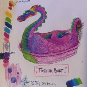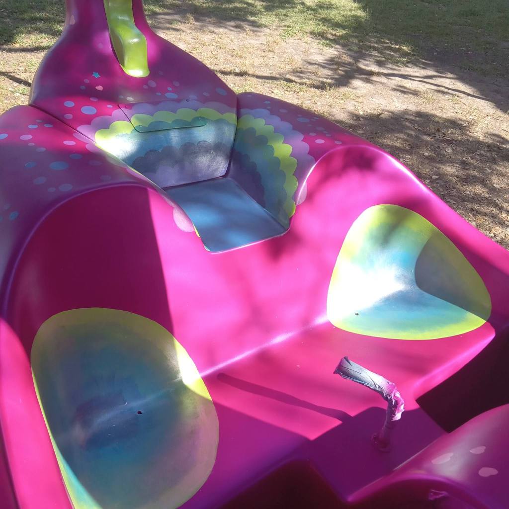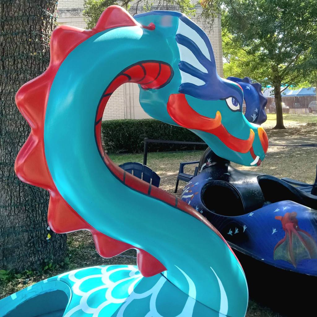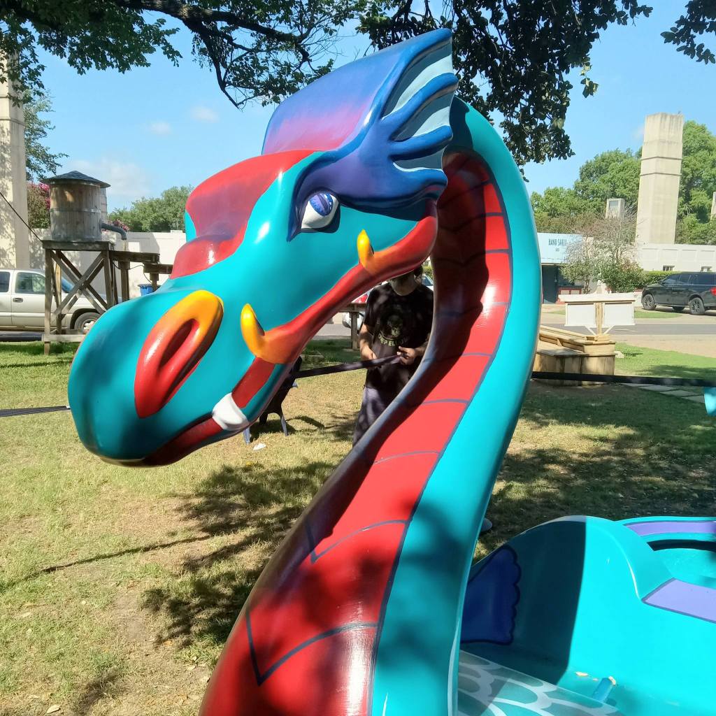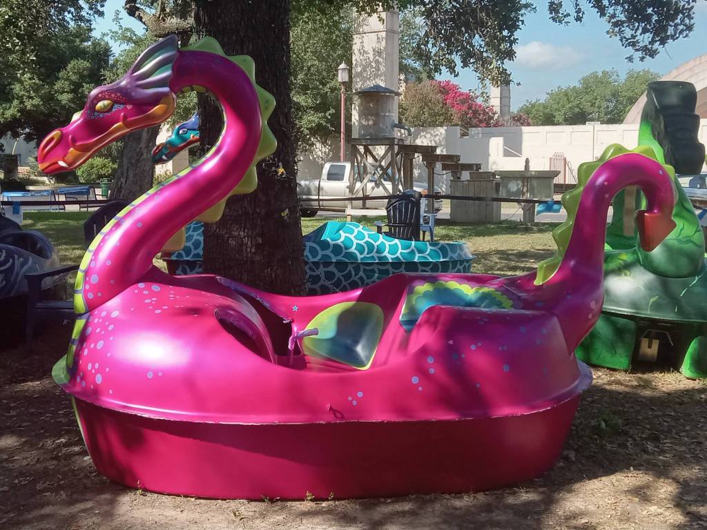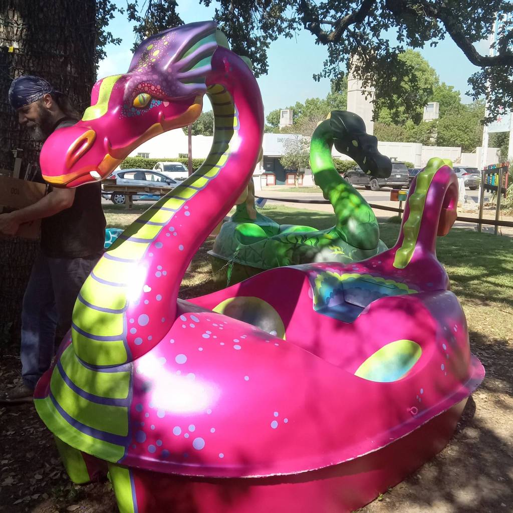 Each year, we have the Texas State Fair for three weeks in the September/October time – drawing people from all over to visit the city and enjoy the park. They typically have about 8 white swan paddleboats you can rent and ride in for half an hour during the fair time within the Leonhardt Lagoon but they typically go into storage for the rest of the year. We have recently been invited to paint 2 of the 6 total DRAGON BOATS by the Children’s Aquarium in Fair Park, just adjacent to the lagoon. My wife and I were excited to get a chance on a job so fun, and selected the blue and metallic pink dragons to paint. For the blue boat, we decided to go for something traditional, in line with the famed Dragon Boat Race boats. We chose a dark and light blue for the scales and bright red flames for contrast. For the pink one, the request was “something a little bit girly in nature” so we went with an idea my wife had about a school notebook she had in grade school with pinks and neon colors. Keeping in line with that idea, we chose lime green, purple, teal, and light pink to detail it with speckles of scales along with a few hearts and stars. Because this boat started out as a metallic fuchsia, we chose to make a metallic/glittery glaze and make sure the sparkles were all around. We even added a little star with my sweet son’s initials in a secret location on this pink boat!